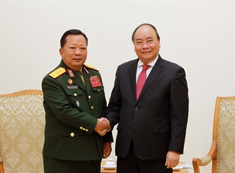 | Le Premier ministre vietnamien Nguyên Xuân Phuc (droite) et le ministre lao de la Défense, Chansamone Channhalat, le 18 décembre à Hanoï. |