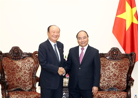 | Le Premier ministre vietnamien Nguyên Xuân Phuc (droite) et le président du groupe sud-coréen Charmvit, Lee Dea Bong, le 22 août à Hanoï. |