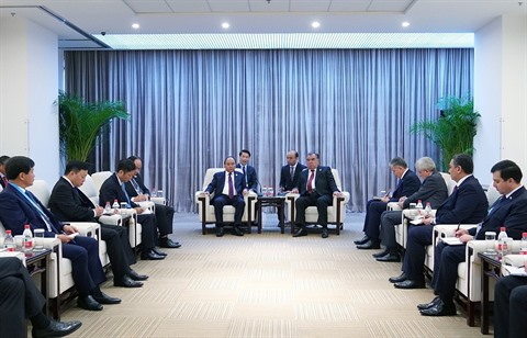 | Rencontre entre le Premier ministre Nguyên Xuân Phuc (gauche) et le président du Tadjikistan, Emmali Rahmon le 26 avril à Pékin. |