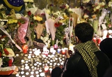 | Un homme rend hommage aux victimes des attaques du Bataclan, le 14 novembre 2015 à Paris. |