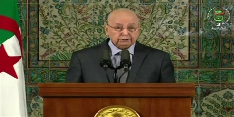 | Abdelkader Bensalah, président de l'Algérie, lors de son allocution sur la télévision officielle, le 6 juin. |
