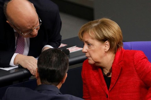 | La chancelière allemande Angela Merkel en discussion avec le ministre des Affaires étrangères Sigmar Gabriel et le ministre des Finances par intérim (gauche) |