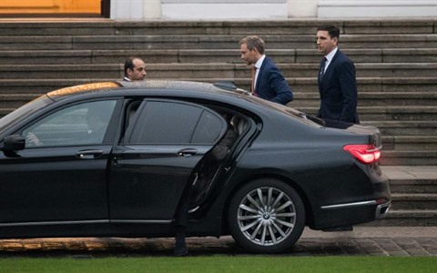 | Le chef du Parti libéral-démocrate (FDP), Christian Lindner (centre), arrive au château de Bellevue à Berlin pour y rencontrer le président de la République fédérale Frank-Walter Steinmeier, le 21 novembre. |