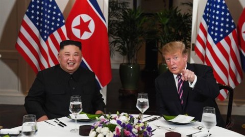 | Le président américain Donald Trump (droite) s'entretient avec son homologue nord-coréen Kim Jong Un, alors qu’ils dînent ensemble au Sofitel Legend Metropole à Hanoï, le 27 février 2019. |
