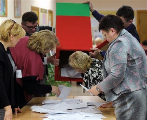 | Décompte des bulletins dans un bureau de vote à Minsk, le 11 octobre lors des élections présidentielles en Bélarus. |