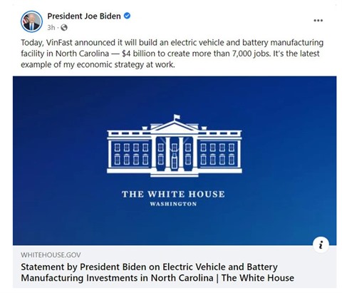 Les comptes Twitter et Facebook du président Biden ont également affiché la déclaration de Biden. Les messages mettent tous en évidence des informations selon lesquelles VinFast construira une usine de batteries et de voitures électriques en Caroline du Nord avec un investissement de 4 milliards d’USD.