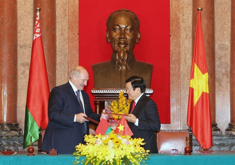 | Le président Truong Tân Sang (droite) et son homologue biélorusse Alexandre Lukachenko signent la Déclaration commune Vietnam-Biélorussie. |