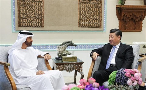 | Le président chinois Xi Jinping (droite) et le prince héritier d'Abou Dhabi, Cheikh Mohammed ben Zayed Al Nahyane, le 20 juillet aux EAU. |