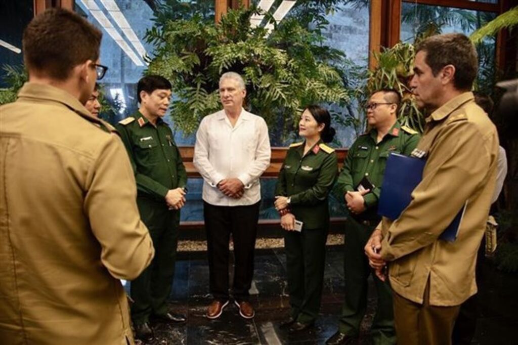 | Le président cubain Miguel Díaz-Canel (centre) converse avec les membres de la délégation de travail du ministère vietnamienne de la Défense. |