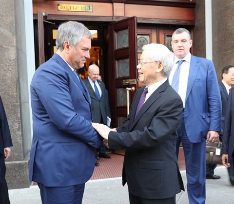 Nguyên Phu Trong et Viatcheslav Volodin ont apprécié le partenariat efficace entre la Douma d'État de Russie et l’Assemblée nationale du Vietnam, et ont convenu que les deux organes législatifs continueraient à échanger des délégations de haut niveau, aux niveaux de commission et de groupes de parlementaires d’amitié afin de renforcer la compréhension mutuelle et de partager les expériences législatives tout en travaillant à créer des conditions juridiques favorables pour traiter les problèmes liés aux voyages, à la vie et au travail des citoyens vietnamiens et russes dans chacun des deux pays.