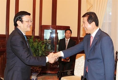 | Le président de la République, Truong Tân Sang (gauche), et le président de la Fédération nationale des coopératives agricoles de la République de Corée, Choi Won-byung, le 15 septembre à Hanoi. |