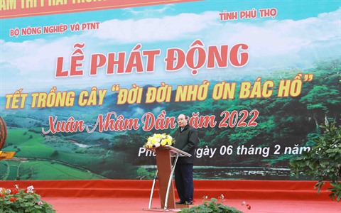 | Le président de la République Nguyên Xuân Phuc prend la parole à la Fête de plantation d'arbres du Printemps du Tigre 2022, le 6 février à Phu Tho (Nord). |