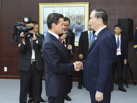| Le président Trân Dai Quang (droite) et son homologue mexicain Enrique Pena Niet lors d'une rencontre bilatérale tenue le 9 novembre en marge du Sommet des dirigeants économiques de l'APEC 2017. |