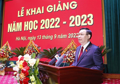 | Le président de l'Assemblée nationale (AN), Vuong Dinh Huê, s'exprimant lors de la cérémonie de rentrée scolaire 2022-2023 de l'Académie de la défense. |