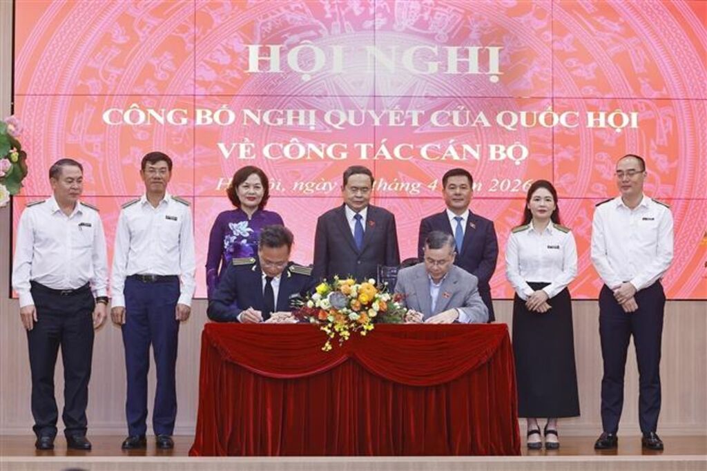 | Le président de l'Assemblée nationale, Trân Thanh Mân (2e plan, centre), assiste à la signature du procès-verbal de passation de pouvoir entre l'auditeur général Nguyên Huu Nghia et son prédécesseur, Ngô Van Tuân, le 7 avril à Hanoï. |