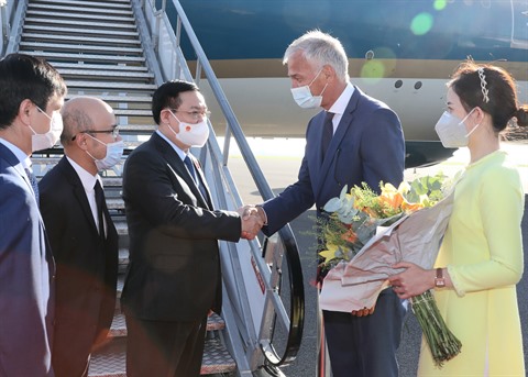 | Le président de l’Assemblée nationale Vuong Dinh Huê (centre) le 8 septembre (heure locale) à l’aéroport international de Melsbroek à Bruxelles. |