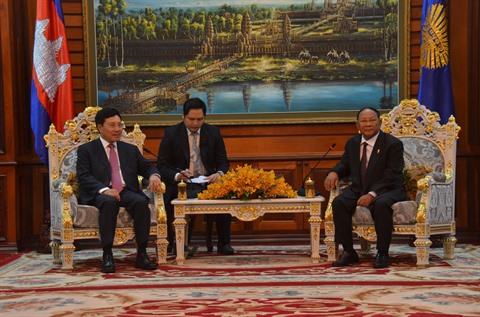 | Le vice-Premier ministre et ministre vietnamien des Affaires étrangères Pham Binh Minh (gauche) et le président de l’Assemblée nationale cambodgienne Samdech Heng Samrin, le 15 mars à Phnom Penh. |