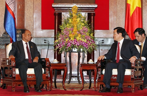 Le même jour, le président de l'AN cambodgienne, Heng Samrin, a été également reçu par le président du Vietnam Truong Tân Sang qui a affirmé que, comme toujours, le Vietnam prenait en haute considération les relations d'amitié et de coopération traditionnelles avec le Cambodge. Il a souhaité que les deux parties oeuvrent pour l'amitié traditionnelle et la coopération intégrale, notamment la coopération entre les deux organes législatifs, pour le développement et la prospérité de chaque pays, de la région et du monde.