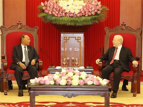 | Le secrétaire général du Parti communiste du Vietnam (PCV), Nguyên Phu Trong (droite), et le président de l'Assemblée nationale du Cambodge, Samdech Heng Samrin. |
