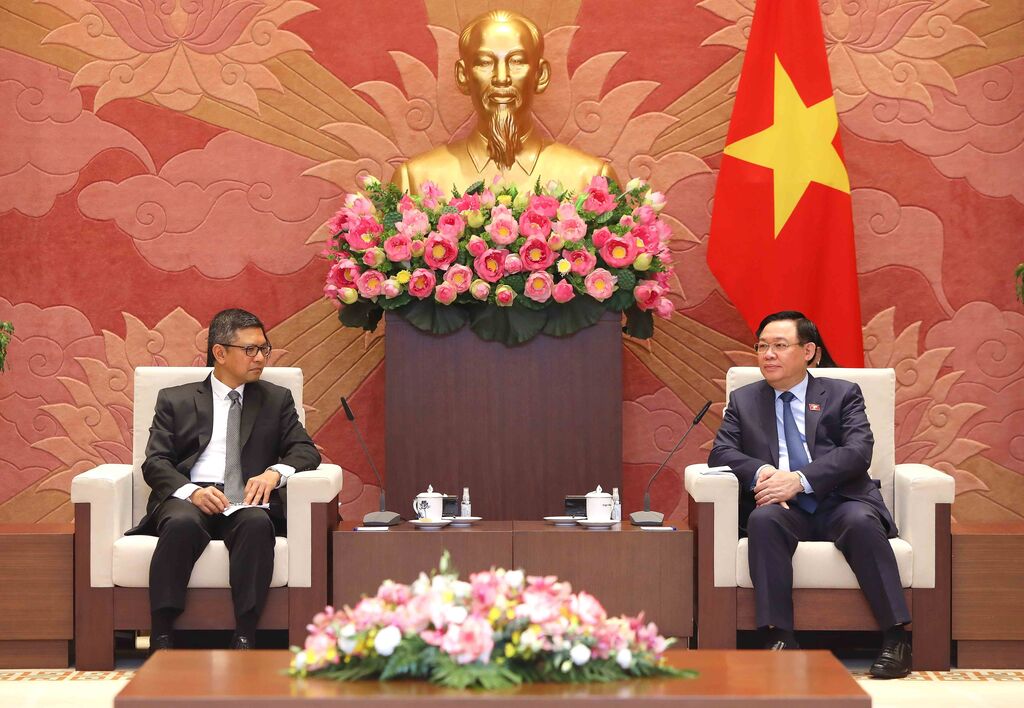 | Le président de l'Assemblée nationale du Vietnam, Vuong Dinh Huê (droite), a reçu le 25 juillet à Hanoï, l'ambassadeur d'Indonésie, Denny Abdi. |