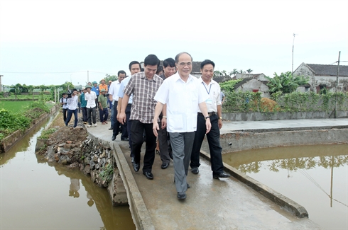 | Le président de l'Assemblée nationale Nguyên Sinh Hùng (premier plan) visite le 17 juillet la commune de Khanh Thành, une des localités typiques dans le mouvement de la Nouvelle campagne |