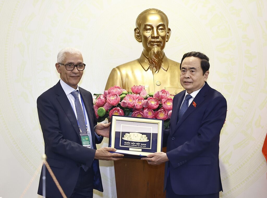 | Le président de l'AN, Trân Thanh Mân (droite), remet un présent au président de la Chambre des représentants du Maroc, Rachid Talbi El Alami. |