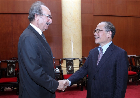 | Le président de l'AN, Nguyên Sinh Hùng (droite), et l'ambassadeur d'Irak, Faris Al-Ani, le 3 avril à Hanoi. Photo : Nhan Sang/VNA/CVN |