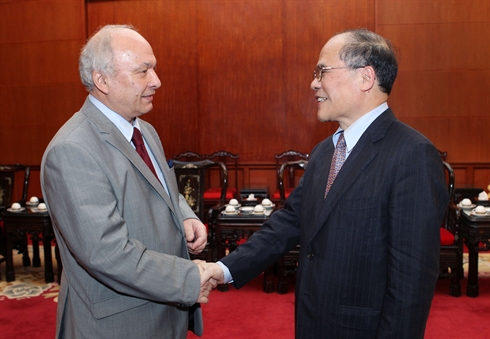 | Le président de l'AN, Nguyên Sinh Hùng (droite), et l'ambassadeur de Roumanie, Dumitru Olaru, le 3 avril à Hanoi. Photo : Nhan Sang/VNA/CVN |