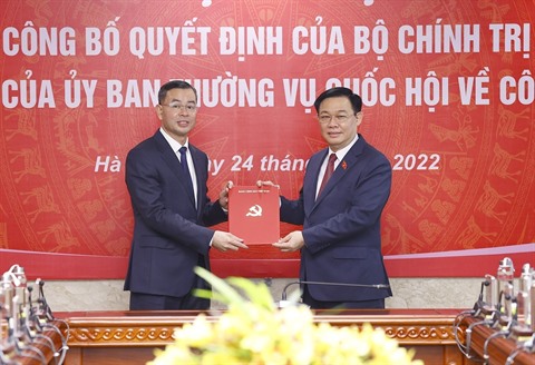 | Le président de l’Assemblée nationale (AN), Vuong Dinh Huê (droite) remet la décision du Bureau politique et la résolution du Comité permanent de l’Assemblée nationale à Ngô Van Tuân. |