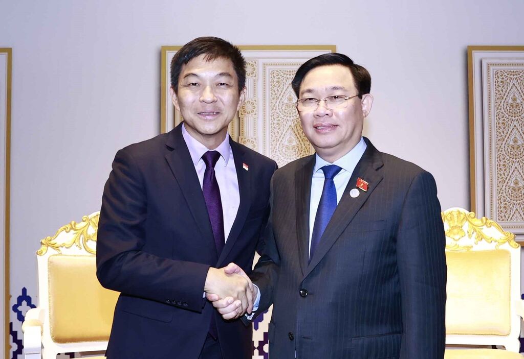 | Le président de l'Assemblée nationale (AN), Vuong Dinh Huê (gauche) et le président du Parlement de Singapour, Tan Chuan-jin. |