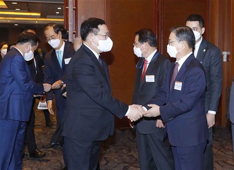| Le président de l'Assemblée nationale, Vuong Dinh Huê (centre), lors d'une rencontre avec des hommes d’affaires sud-coréens à Séoul, le 14 décembre. |