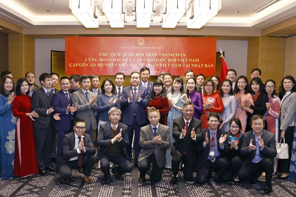 | Le président de l'AN rencontre le personnel de l'ambassade du Vietnam au Japon. |