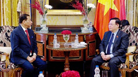 | Le président de l'Assemblée nationale, Vuong Dinh Huê (droite), reçoit le milliardaire Prashant Ruia, président du groupe Essar. |