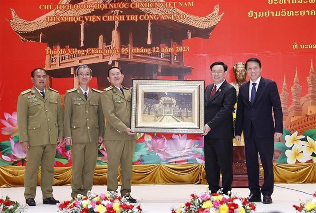 | Le président de l’Assemblée nationale du Vietnam, Vuong Dinh Huê (2e à droite) offre un cadeau de souvenir à l’Académie politique de la Police lao, le 5 décembre à Vientiane. |