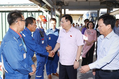 | Le président de l'Assemblée nationale Vuong Dinh Huê rencontre des ingénieurs de la Compagnie par actions de la raffinerie et de la pétrochimie Binh Son (BSR). |