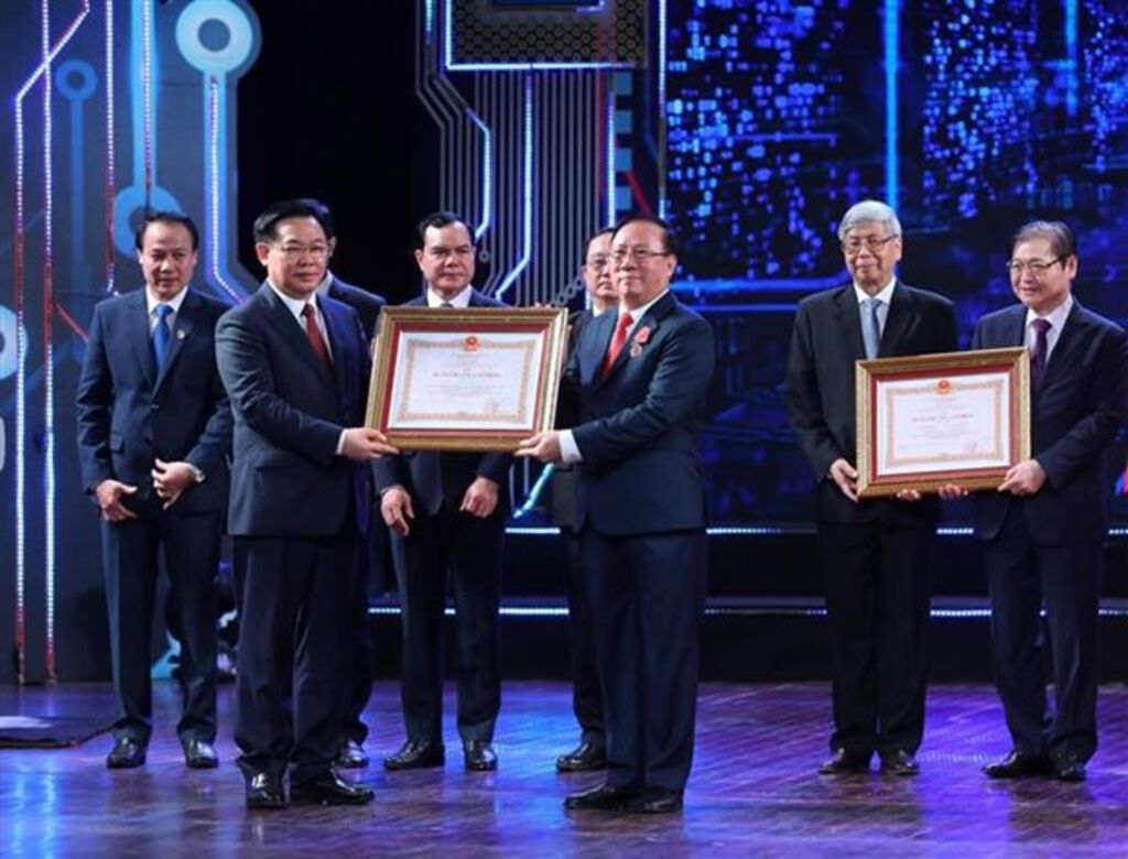 | Le président de l'AN du Vietnam, Vuong Dinh Huê (premier plan, à gauche), décerne l'Ordre du Travail de première classe au vice-président permanent du VIFOTEC, Lê Xuân Thao. |