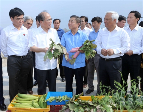 | Le président de l'Assemblée nationale Nguyên Sinh Hùng (2e, gauche) dans la ferme aux légumes de la commune côtière de Thach Van, district de Thach Hà. |