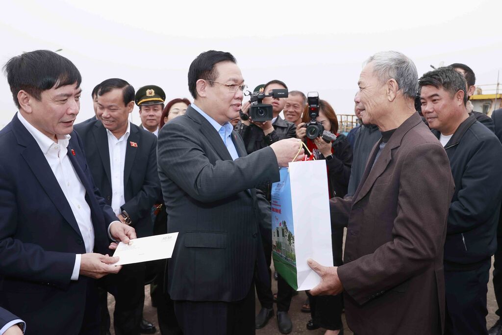 | Le président de l’AN, Vuong Dinh Huê (centre), offre des cadeaux du Têt à des pêcheurs de Quang Binh. |