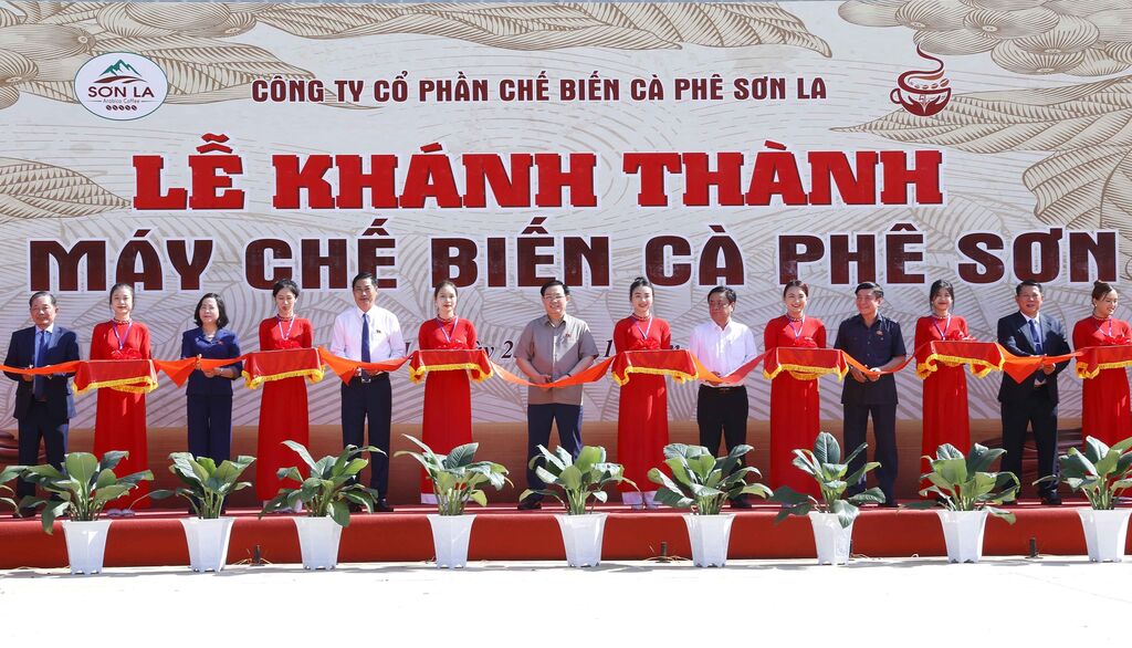 | Le président de l'Assemblée nationale Vuong Dinh Huê (centre) coupe la bande d'inauguration de l'usine de transformation de café à Son La. |