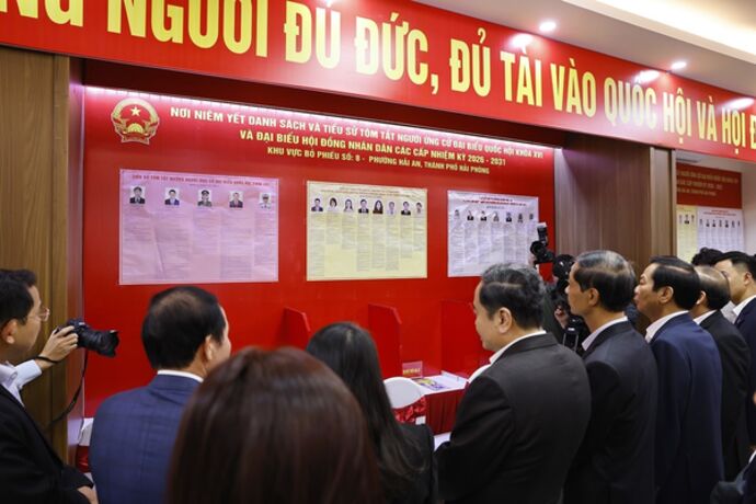 Plus tôt dans la journée, le dirigeant s'était rendu dans un bureau de vote du quartier de Hai An, à Hai Phong, afin d'inspecter les préparatifs.