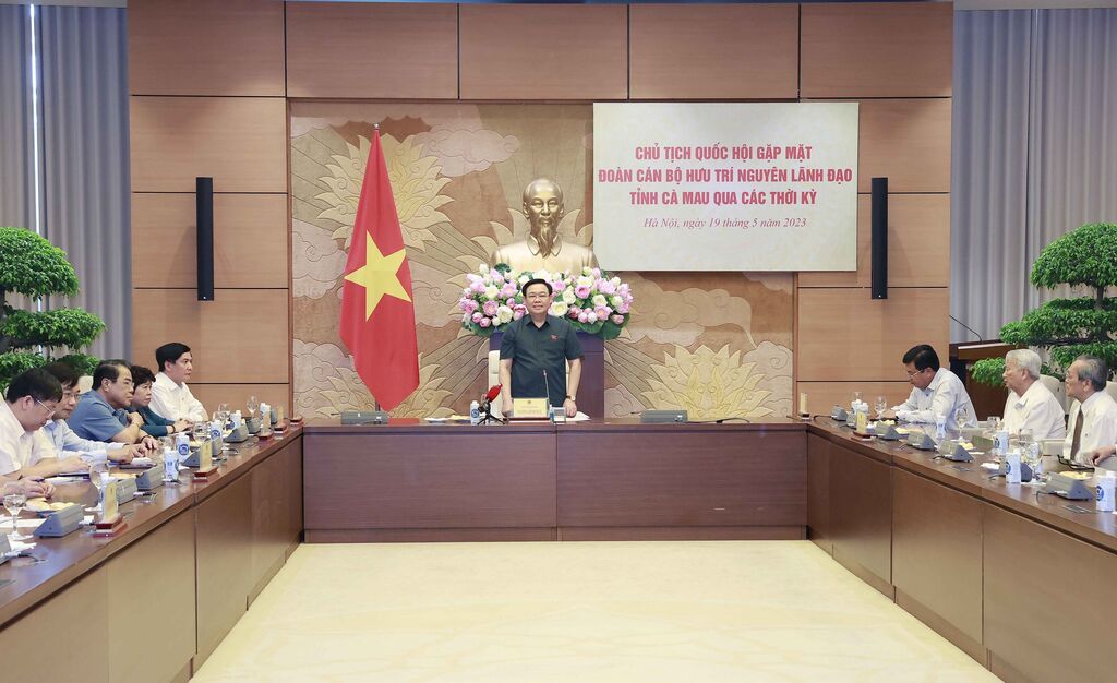 | Séance de rencontre entre le président de l’AN, Vuong Dinh Huê (debout), et des cadres retraités qui étaient d'anciens dirigeants de Cà Mau, le 19 mai à Hanoï. |