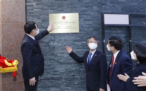 | Le président de l’Assemblée nationale Vuong Dinh Huê (gauche) à nouveau siège de l'ambassade du Vietnam en R. de Corée, le 14 décembre. |