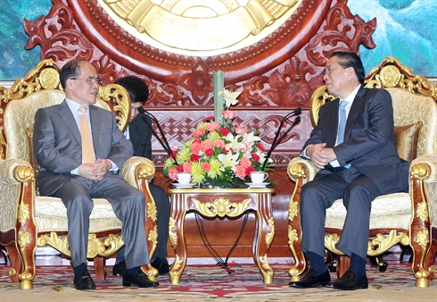 | Le président de l'AN, Nguyên Sinh Hùng (gauche), a été reçu mardi 16 septembre à Vientiane par le secrétaire général du PPRL et président du Laos, Choumaly Sayasone. |