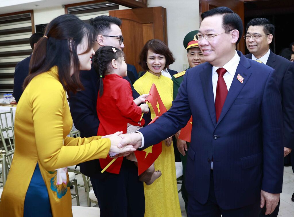 | Le président de l'AN, Vuong Dinh Huê, rencontre le personnel de l'ambassade du Vietnam aux Philippines. |