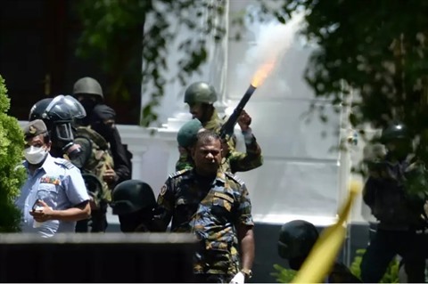 | Un soldat tire une grenade de gaz lacrymogène pour tenter de disperser les manifestants, devant les bureaux du Premier ministre à Colombo le 13 juillet |