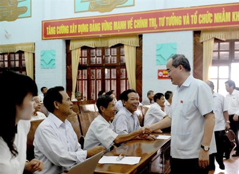 | Le président du CC du FPV, Nguyên Thiên Nhân (premier plan, debout), a rencontré le 4 juillet, des électeurs du district de Hiêp Hoa, province de Bac Giang. |