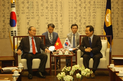 | Le président du Front de la Patrie du Vietnam, Nguyên Thiên Nhân (gauche), et le président de l'Assemblée nationale sud-coréenne Chung Sye-kyun. |