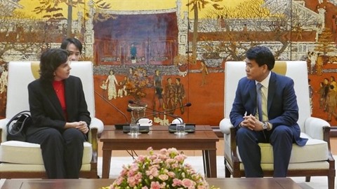 | Le président du Comité populaire de Hanoï, Nguyên Duc Chung, reçoit l’ambassadrice de Cuba, Lianys Torres Rivera. |