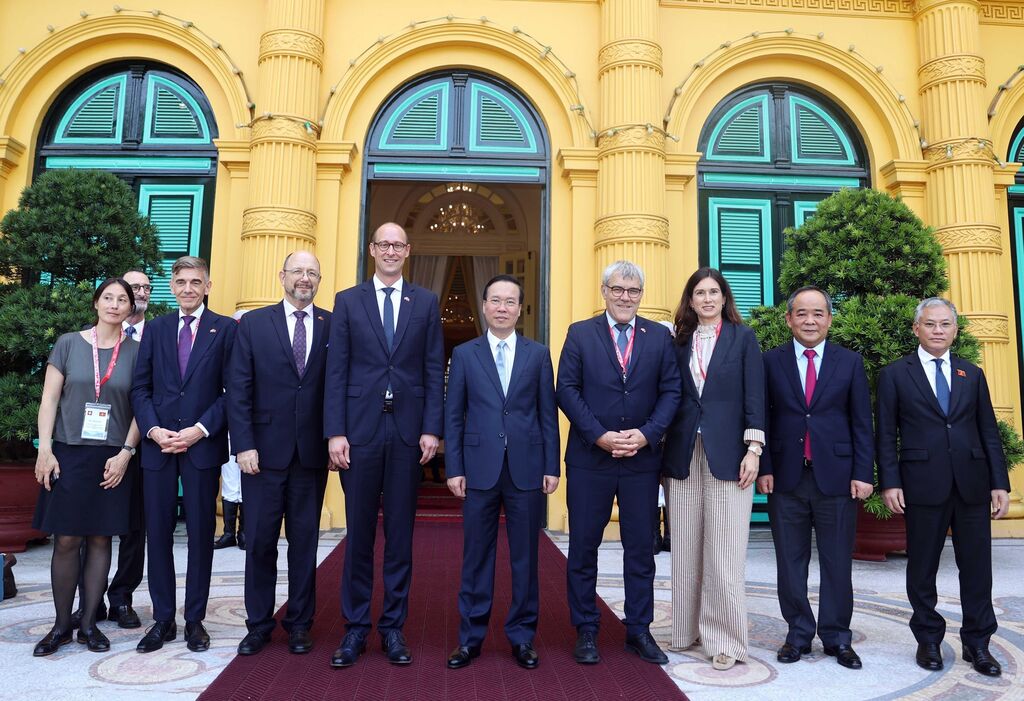 | Le président du Conseil national suisse Martin Candinas (4e à gauche), reçu par le président vietnamien Vo Van Thuong (centre), le 30 juin à Hanoï. |