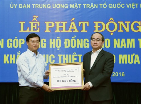 | Nguyên Thiên Nhân (droite), reçoit 100 millions de dôngs du Comité central de l'Union de la jeunesse communiste Hô Chi Minh pour aider les sinistrés du Centre, le 20 décembre à Hanoï. |